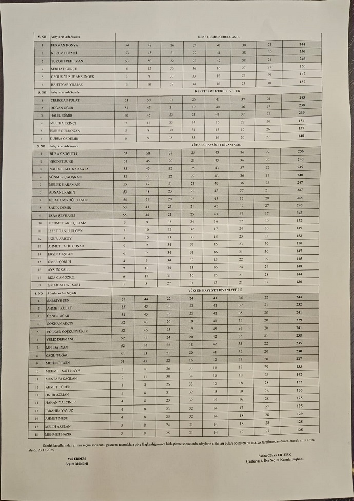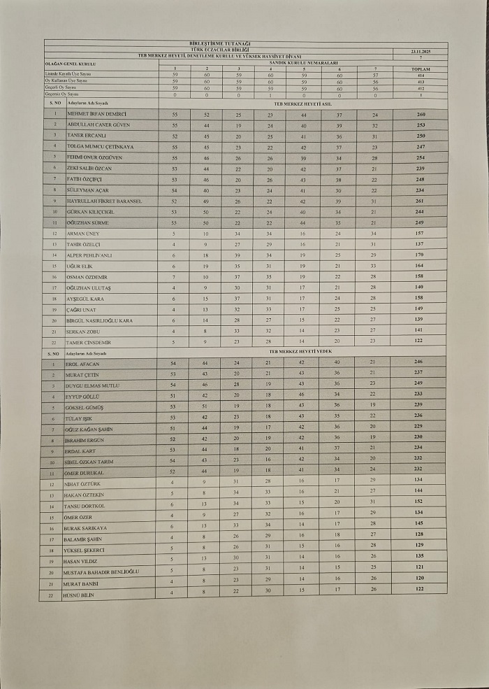 Türk Eczacıları Birliği 45. Olağan Büyük Kongresi’nin 23 Kasım 2025 tarihinde yapılan Merkez Heyeti, Denetleme Kurulu ve Yüksek Haysiyet Divanı seçimleri için kesin olmayan sonuçları gösterir seçim tutanakları aşağıda yer almaktadır.